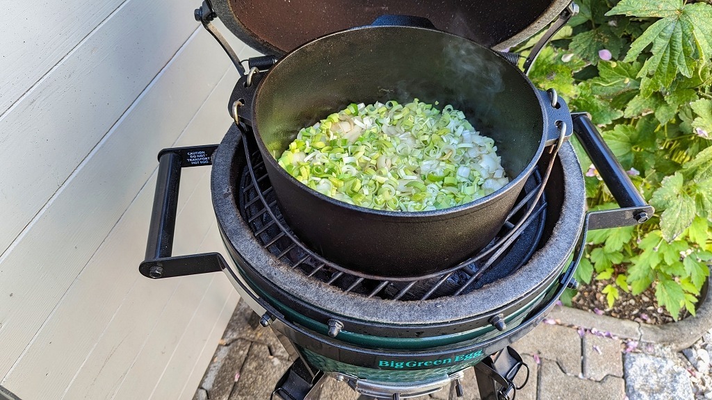- Den Lauch zu den Zwiebeln geben und mit anschwitzen