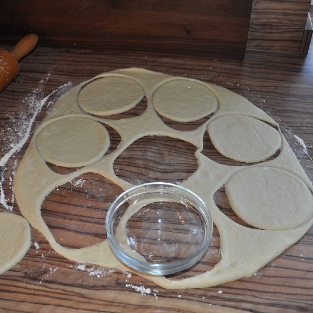 - Nun den Teig ca. 5mm dick ausrollen und mit einem Ausstecher von 11cm Durchmesser die Teiglinge ausstechen.