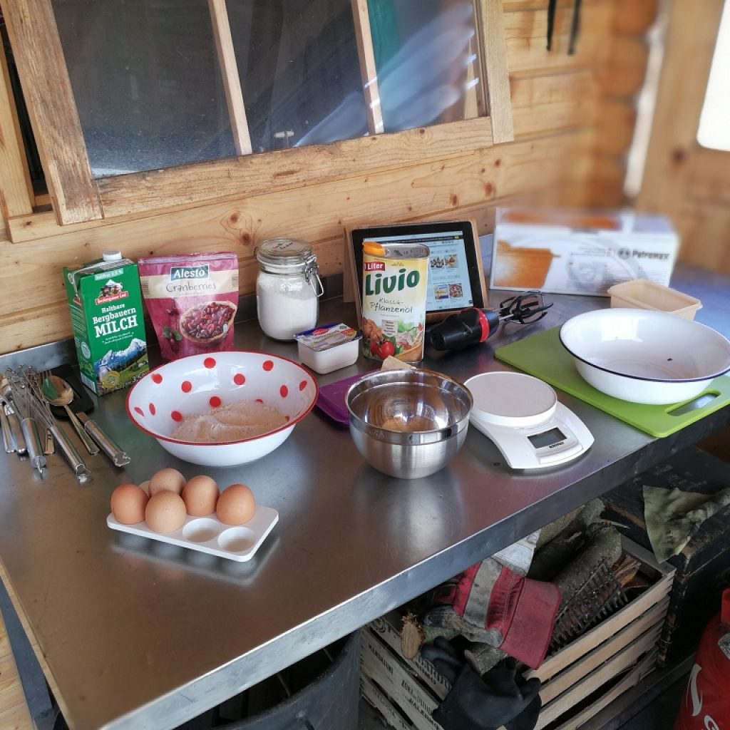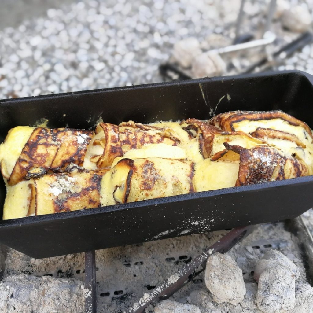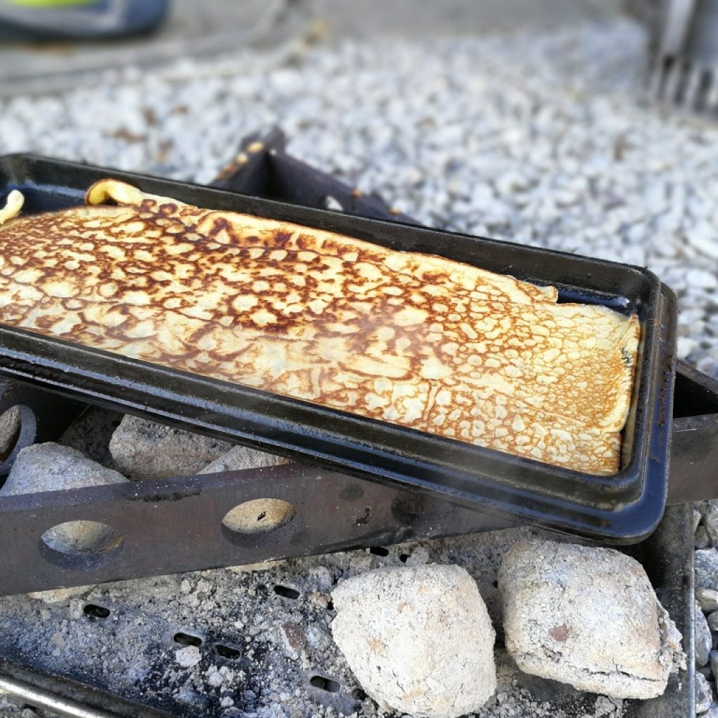 - 8 glühende Kohlen unter den Deckel der K4 legen, Trennfett oder 1 EL Öl hinzugeben, 1 Schöpfer Teig eingießen, verlaufen lassen und backen.