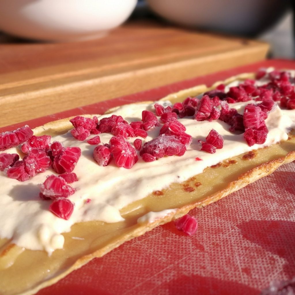 - Die Füllung auf dem Palatschinken verteilen und die gefrorenen Himbeeren darauf zerbröseln und einrollen. Mit den restlichen ebenso vorgehen.