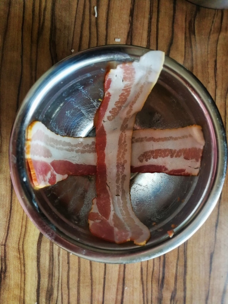 - In einer Schüssel mit ca. 10cm 4 Scheiben Bacon über Kreuz einlegen