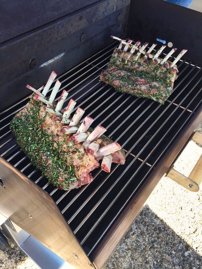 - Das Lammkarree parieren, überschüssiges Fett entfernen, die Rippenknochen putzen, dies sieht geschmackvoller aus. Die Kräuter und den Knoblauch klein hacken und mit dem Olivenöl, Salz und Pfeffer mischen. Das Karree rundum scharf anbraten und mit der Kräutermasse einreiben. Nun das Fleisch aufgestellt indirekt bei 100-110 Grad für eine gute Stunde grillen bis zu einer Kerntemperatur von 58 Grad.