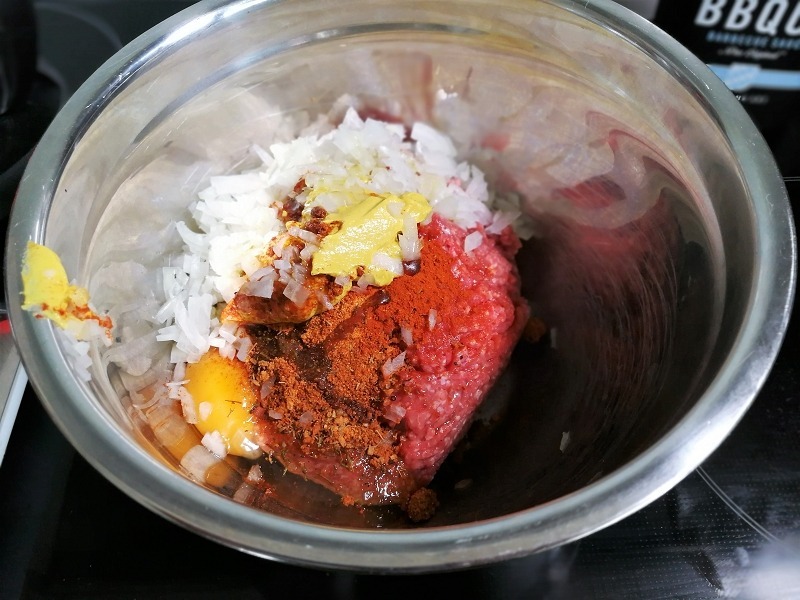 - Los geht es in dem man aus allen Zutaten ausser dem Speck und Käse eine Hackfleischmasse herstellt, das Ei dient in dem Fall der Bindung damit die Bällchen in Form bleiben.