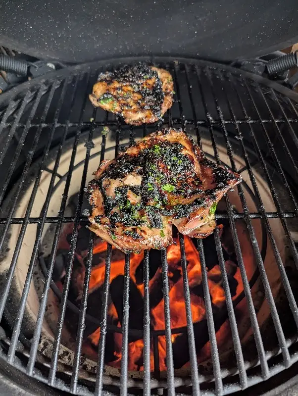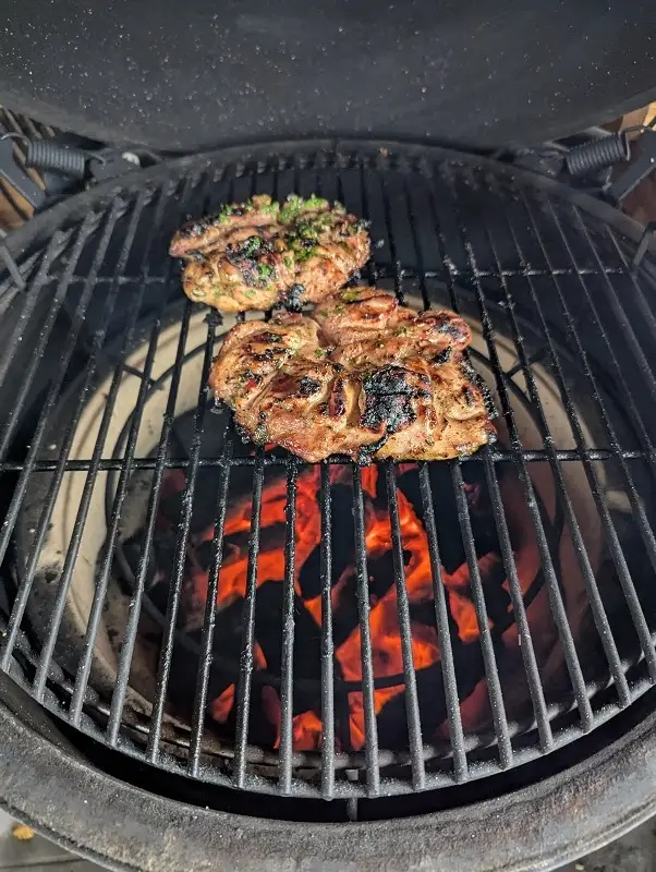 - Den Grill auf gut 250 Grad und direkte Hitze vorheizen, das Fleisch kommt direkt aus der Marinade auf den Grill, nur kurz den Saft abtropfen lassen.