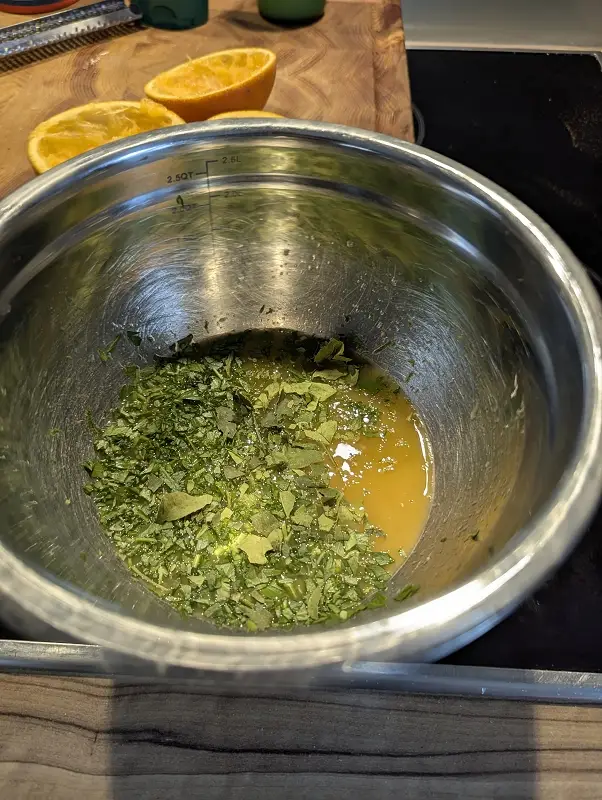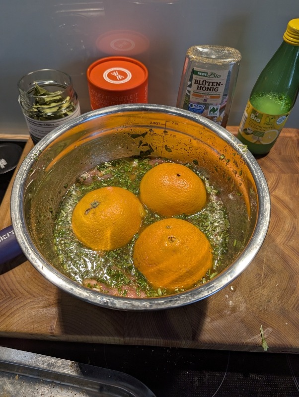 - Zum Schluss kommen die Orangenschalen als Beschwerung aufs Fleisch, so das dieses im Saft marinieren kann. Das beste Ergebnis erzielt man, wenn das ganze 4-6 Stunden im Kühlschrank abgedeckt mariniert wird. Für Kurzentschlossene sollten es aber mindestens eine Stunde sein.