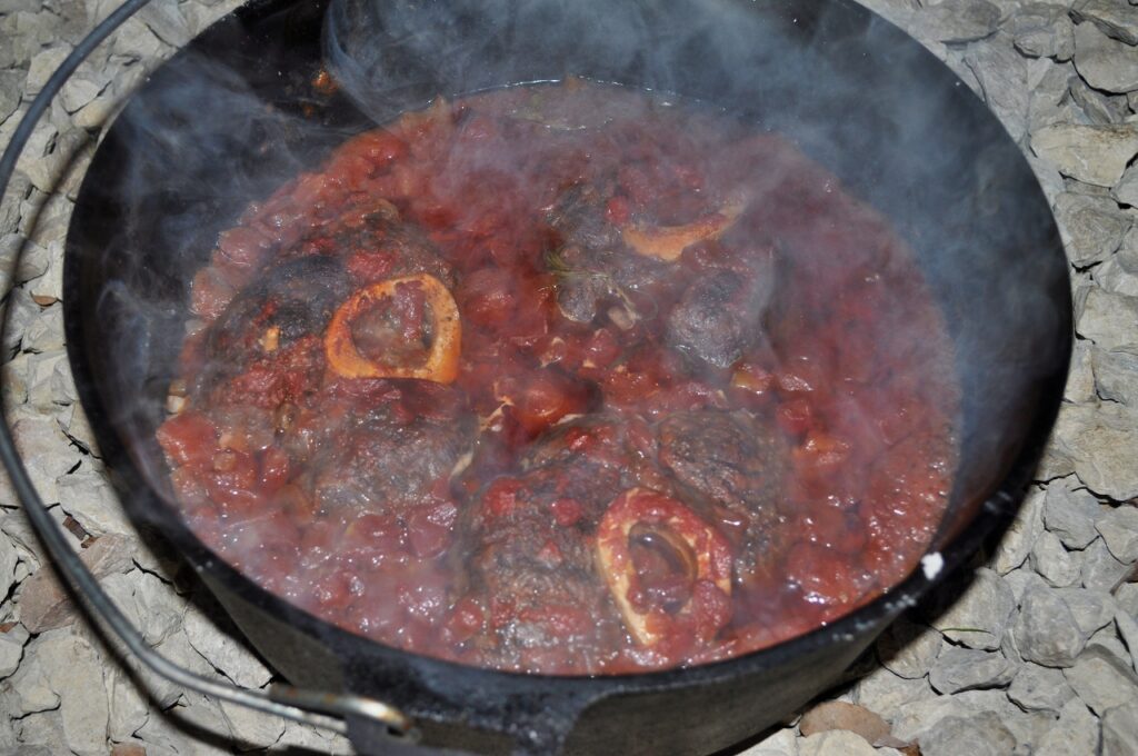 - Den Dutch Oven auf den Anzündkamin stellen, das Öl zum Anbraten hinzugeben und die Beinscheiben auf beiden Seiten anbraten und wieder herausnehmen. .
