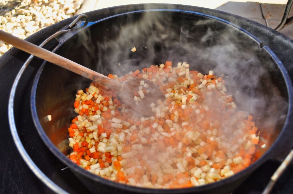- Jetzt kommt das Wurzelgemüse hinein und wird schön angedünstet und mit dem Rotwein abgelöscht.
