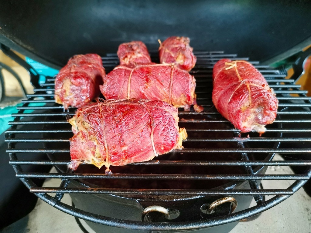 • Jetzt wird der Rinderfond zugegeben und der Durch Oven in den auf smoken vorbereiteten Grill (120 Grad) in den indirekten Bereich gestellt, ein Grillrost auf den Dutch Oven gelegt und darauf die vorbereiteten Rouladen gelegt. Mit Hilfe von Holzchunks oder Chips wird das ganze nun für 30-60Minuten gesmokt.