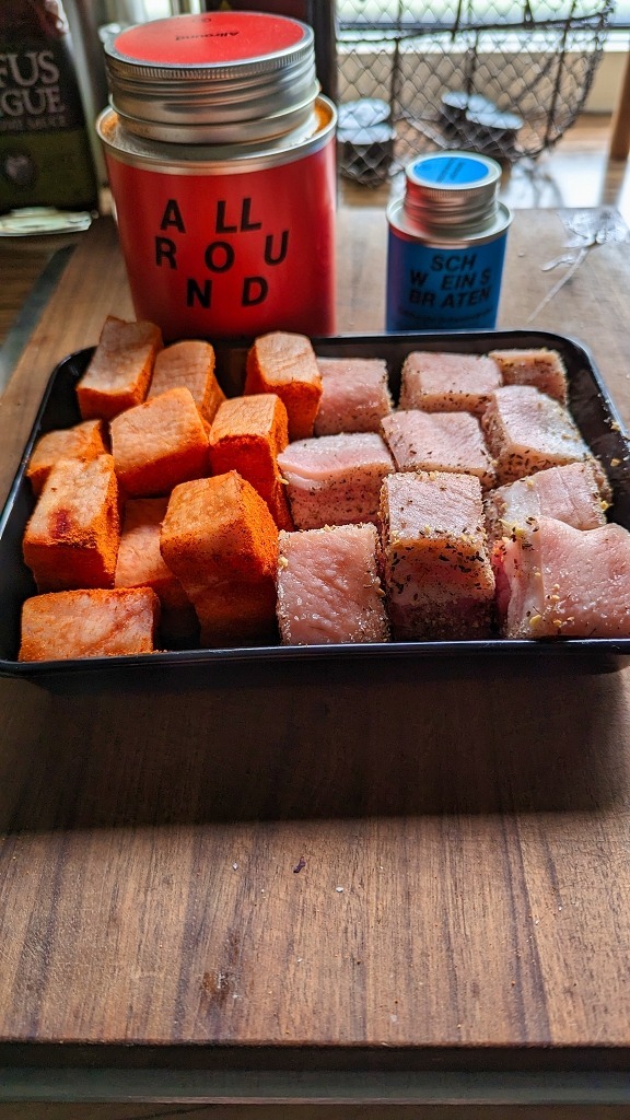 - Jeder Würfel bekommt einen Holzspieß, welcher von unten bis kurz vor die Schwarte durchgesteckt wird und bei mittlerer Hitze auf die Gussplatte des Grills mit der Schwarte nach aussen zeigend, bzw. auf der Feuerplatte zum Feuer hin.