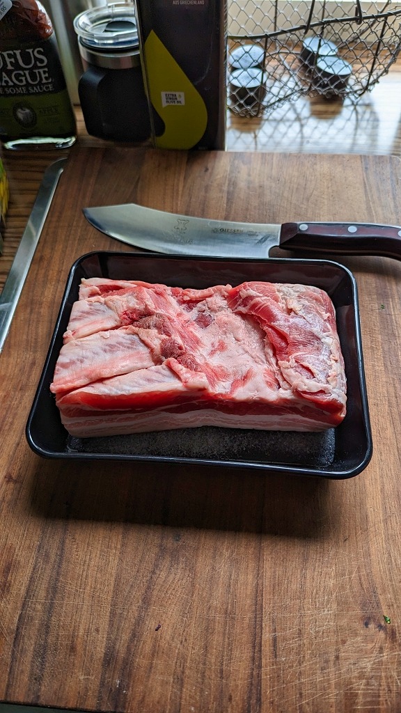 - Das die Schwarte sicher aufknuspert gibts einen Trick, einfach Salz in eine flache Schale geben und den Schweinebauch mit der Schwarte nach unten darauf legen und 3-4 Stunden ziehen lassen. Das entzieht der Schwarte genug Feuchtigkeit.