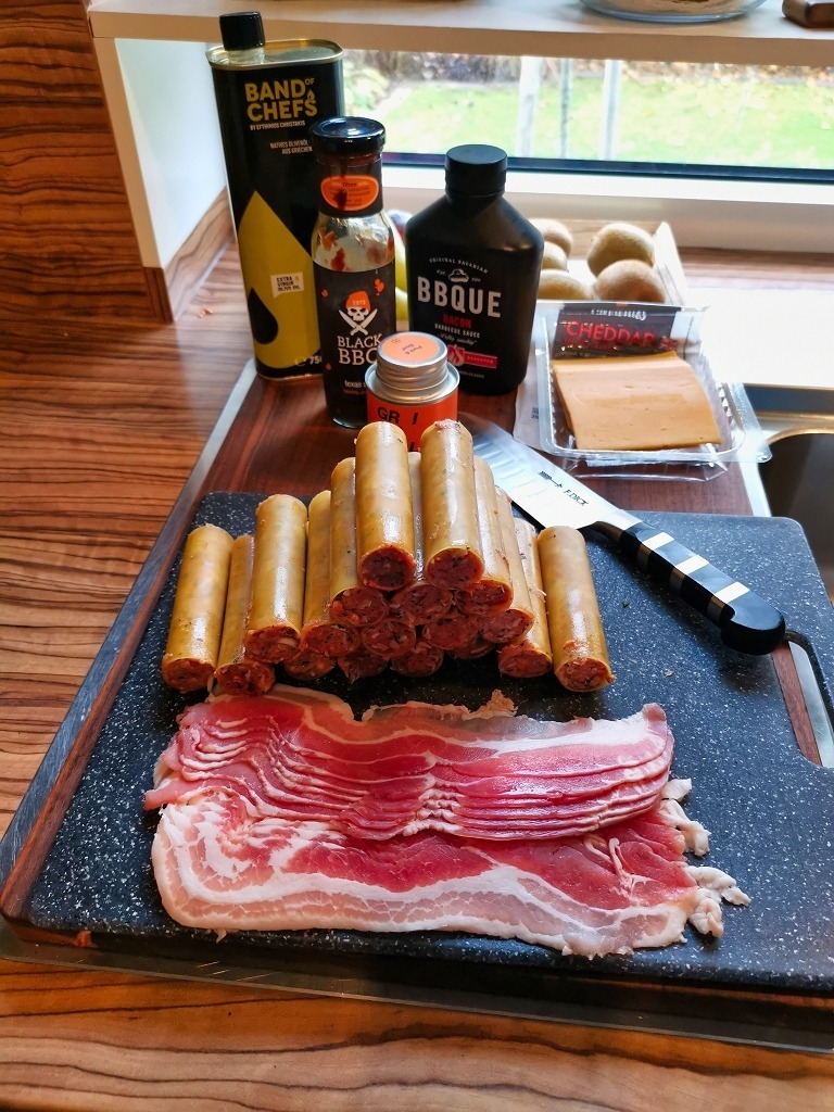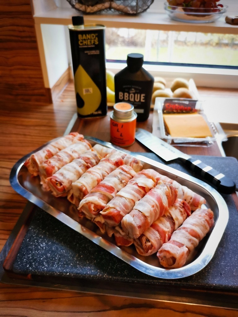 - Zuerst wird eine Scheibe Bacon auf dem Brett gelegt und eine gefüllte Cannelloni darauf gelegt und BBQ Sauce darüber gegeben.