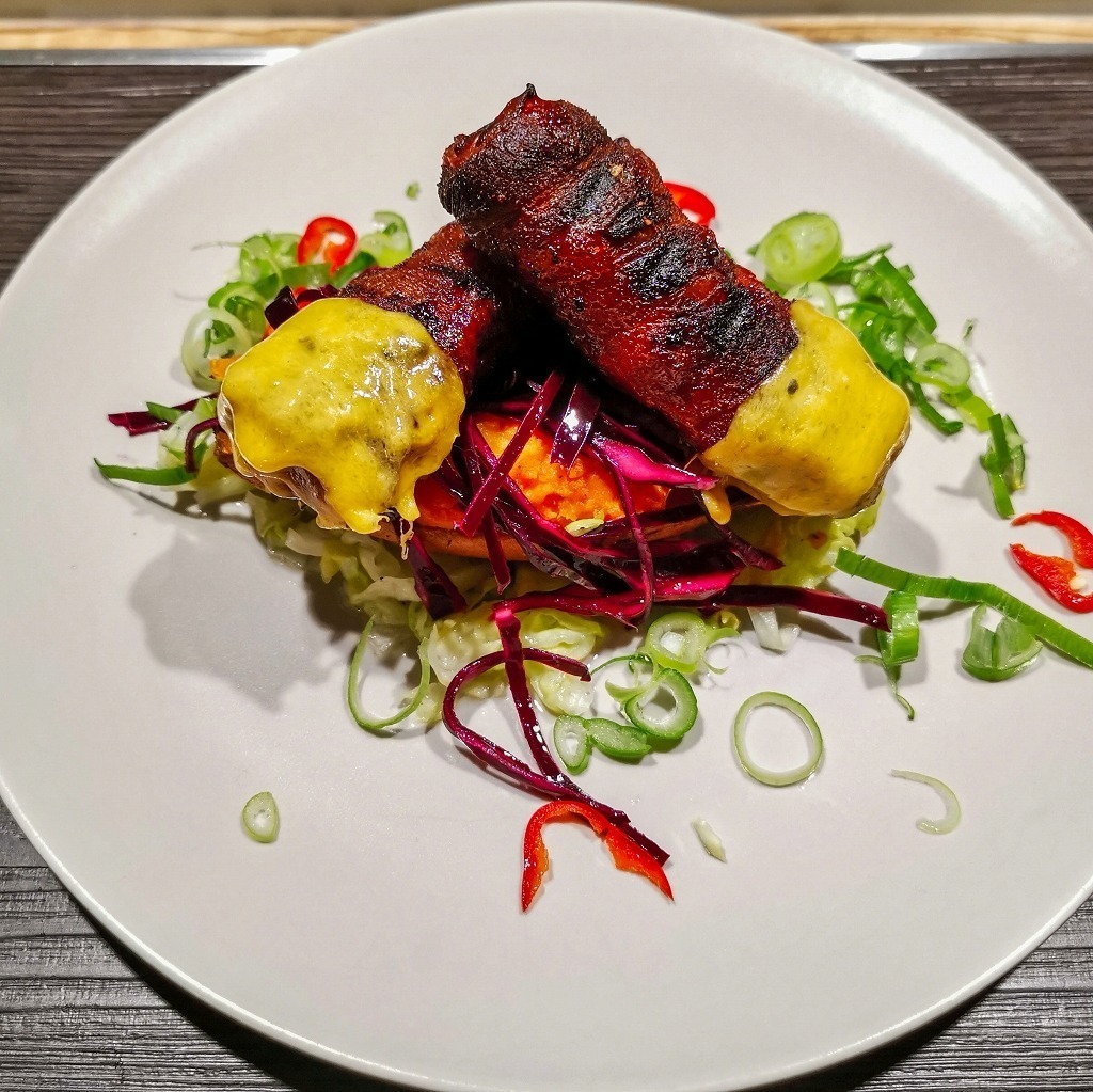 - Zuerst kommt die Süßkartoffel auf den Teller, garniert mit der Sour Cream, daran angelehnt 2-3 Shotgun Shells, optional kann man noch Blattsalat reichen.