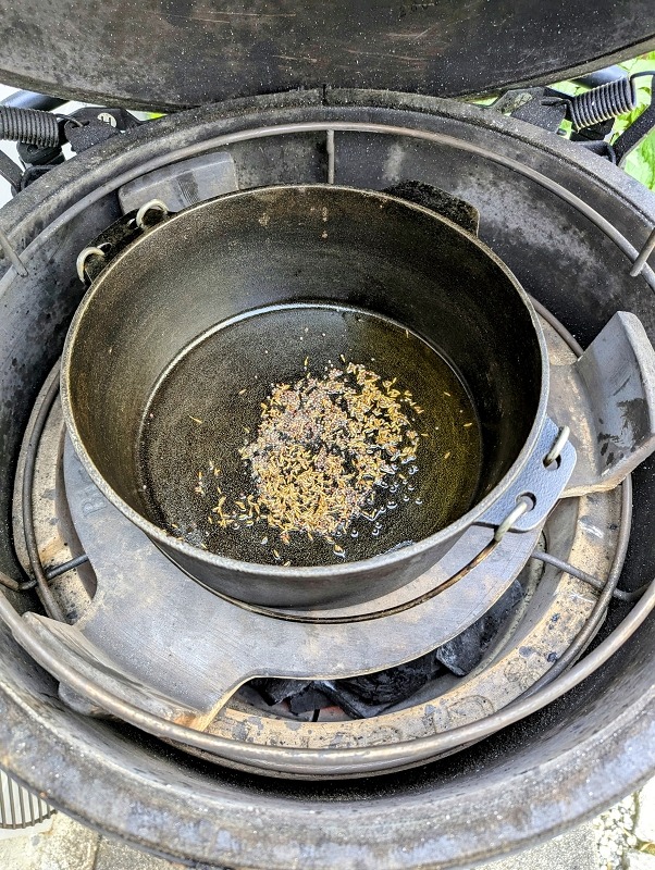- Den Dutch Oven im Grill mit dem Ghee vorheizen und Kurkuma, Chilipulver, Kardamom, Senfsaat und Kreuzkümmel anrösten, dadurch wird das Ghee durch die austretenden Öle aromatisiert