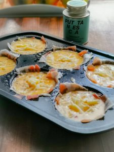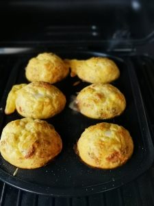 Danach die Speckscheiben in der Länge halbieren und kreuzweise in die gefettete Muffinform legen und die Rühreimasse nun gleichmäßig in die 6 Formen verteilen und den geriebene Käse drüber gegeben
