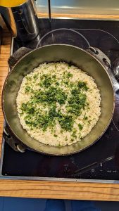 danach ein weiteres drittel des Reis, darüber ½ Bund Korinader (Petersilie)
