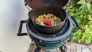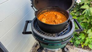 Eine bis 1,5 Stunden schmoren lassen, bei Verwendung von Kohlen kommen 4 Stück unter den Top und 8 Stück auf den Deckel, ganz außen angeordnet.