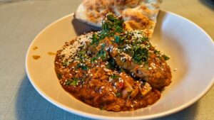 Das indische Gewürz hinzugeben und mit anbraten, hierbei auf die Packungsangabe achten und erstmal mit der halben Menge anfangen.