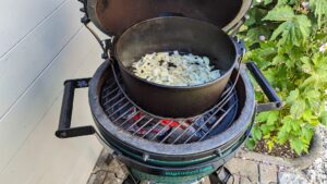 Wenn der Grill heiß ist, bzw. die Kohlen glühen kann man den Dutch Oven anstellen, das Sesamöl hinzugeben und das Fleisch auf beiden Seiten kurz anbraten.