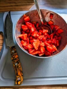 Erdbeeren klein schneiden und mit der Marmelade und dem Lollipopgewürz glatt rühren