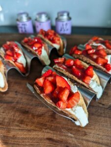 Die Tülle ca. 1 cm breit aufschneiden und die Masse halb hoch in den Taco drücken und darüber die Erdbeeren geben