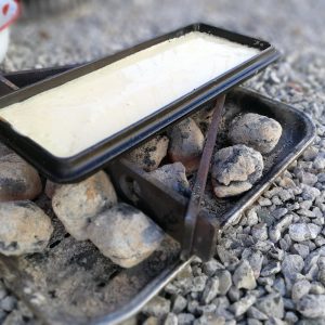 8 glühende Kohlen unter den Deckel der K4 legen, Trennfett oder 1 EL Öl hinzugeben, 1 Schöpfer Teig eingießen, verlaufen lassen und backen. Palatschinken wenden und fertig backen. 8 weitere Palatschinken backen.