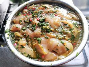 Die Petersilie, Ingwer, Chili fein hacken, die Knoblauchzehen pressen und mit den restlichen Zutaten in einer verschließbaren Schüssel vermischen