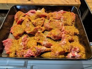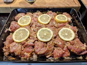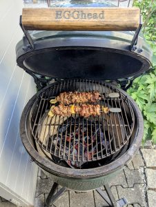 Danach kommt der Knoblauch auch herunter und wird kurz abgekühlt. Den Grill nun auf volle Power stellen und das Fleisch solange ringsherum weiter anbraten bis es schön knusprig ist. Wir haben noch Fladenbrot vom Türken mitgenommen und es zum Schluss mit im Grill erwärmt, hierzu habe ich die dritte Ebene des EGGspander eingebaut.