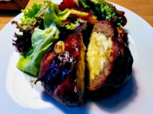 Grill auf 110 Grad zum smoken vorbereiten, ich habe ein Stück Zwetschgenholz zum räuchern auf den Brenner gelegt.Die Balls werden mit der Nahtstelle nach unten und im indirekten Bereich für 30 min auf den Grill gelegt.
