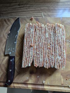 Jetzt werden von links nach rechts die vier Spieße auf halber Höhe eingeschoben und zwischen den Spießen durchgeschnitten und auf einem Gitter platziert