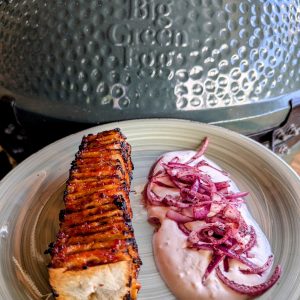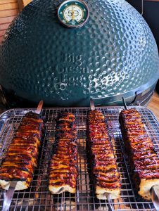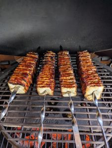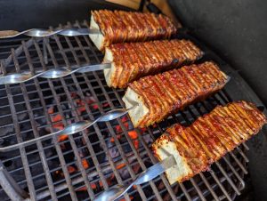 Der Grill wird auf direkte Hitze vorbereitet, die Temperatur sollte um die 250 Grad haben, nicht heißer, da uns sonst die Spieße zu schnell dunkel werden.
