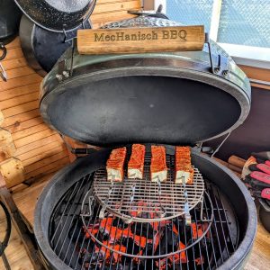 Zum Schluss noch für gut 5 Minuten indirekt ziehen lassen, hierzu die Spieße weg von der direkten Hitze oder wie bei mir mit einem Deflektor für Abschirmung sorgen.