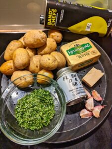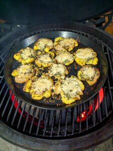 Nun wird die flüssige Butter auf allen Kartoffeln verteilt und bei 200 Grad indirekter Hitze für 20 Minuten gebacken.