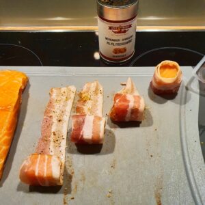 Den Grill auf 220 Grad mit einer Gussplatte vorheizen und die Lachspralinen rundherum anbraten