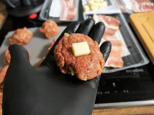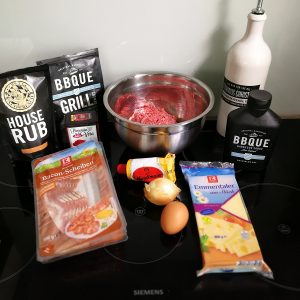 Los geht es in dem man aus allen Zutaten ausser dem Speck und Käse eine Hackfleischmasse herstellt, das Ei dient in dem Fall der Bindung damit die Bällchen in Form bleiben.