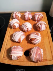 Zum Schluss kreuzweise je zwei Scheiben Bacon ummanteln und mit dem Ende der Scheibe nach unten zur Seite legen.