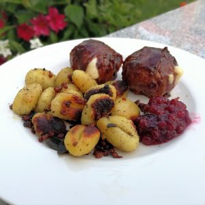 Mit einem Holzspieß kann man die Balls als Fingerfood servieren, oder wie hier als vollwertiges Gericht mit Salbei-Speck-Gnocchi.
