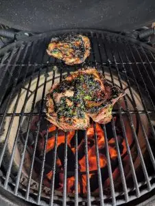 Den Grill auf gut 250 Grad und direkte Hitze vorheizen, das Fleisch kommt direkt aus der Marinade auf den Grill, nur kurz den Saft abtropfen lassen.