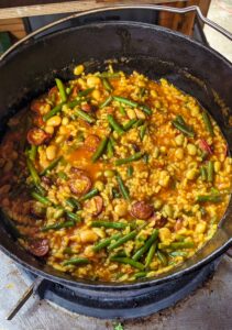 Während das Fleisch nun gart, wenden wir uns der eigentlichen Paella zu. Dazu die Kohlen im Anzündkamin (AZK) durchglühen lassen und den Dutch Oven mit Hilfe der AZK-App darauf stellen. Zuerst braten die Chorizoscheiben in ein wenig Olivenöl an, geben die Zwiebel hinzu, schwitzen diese mit an, danach folgen die Buschbohnen, Tomaten und der Knoblauch, sowie eine Prise Salz. Wenn alles ein wenig Farbe bekommen hat, geben wir Tomatenmark hinzu, lassen dies kurz mit anbraten und löschen mit der Hühnerbrühe ab, geben den Safran hinzu und lassen alles für 10 Minuten köcheln.