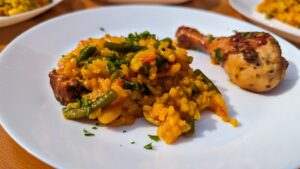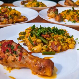 Auf dem Teller eine Portion Paella und einen Schenkel oder mehr dazugeben, wer Schärfe mag kann noch Sriracha Sauce hinzugeben