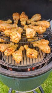 Zuerst würzen wir die gewaschenen Drumsticks und Kaninchenbeine, trocknen diese, geben diese mit dem Rub und 2 EL Olivenöl in eine Schüssel und verteilen den Rub gleichmäßig