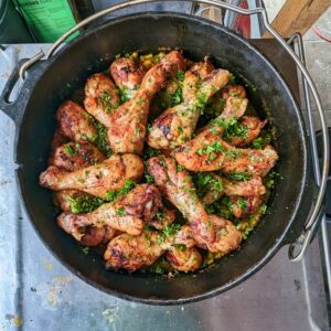 Da im Dutch Oven gegenüber der Paellapfanne Platzmangel herrscht, mache ich meine Schenkel nebenbei im Grill, hier bekommen sie ein super Raucaroma ab, was dem Gericht am Ende gut tut. Hierzu den Grill auf 200 Grad indirekter Hitze einriegeln und die Schenkel für 30 Minuten grillen.