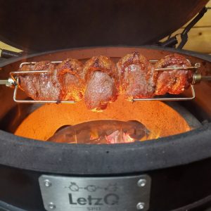 Der Kamado wird auf direkte Hitze eingerichtet und mit zwei Glutnestern auf 220 Grad eingeregelt, zusätzlich natürlich die Rotisserie einlegen.