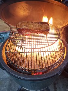 Den Grill auf indirektes grillen und 120 Grad einregeln und den Schweinebauch mit der Schwarte nach oben für ca. zwei Stunden und einer Kerntemperatur von 70 Grad ziehen lassen.