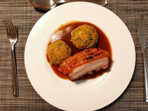 Nebenher habe ich aus Wurzelgemüse, Fleischabschnitten und Bratenfond eine leckere Sauce gezogen und gemeinsam mit dem Fleisch und den Knödeln serviert.